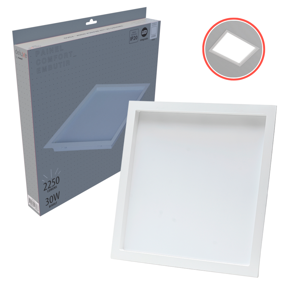 - 1 Painel Led 30w Comfort Embutir Quadrado Bivoltt - Avant. (Disponível nas cores Branco Quente 2700k, Branco Neutro 4000k e Branco Frio 6500k).